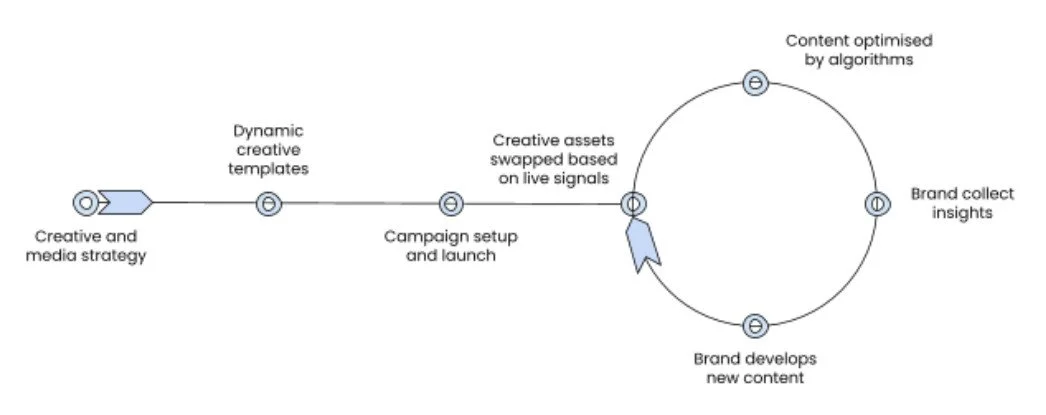 Begin with creative and media strategy, then gather and optimise data, then create new content. Creating dynamic ad templates allows for real-time creative element addition and combination. Then technologies like Cloud Vision API can analyse visual elements and determine what works best, like showing a person in an ad or just showing the product. With some trial and error, new creative elements can be added to the mix and used in the ad templates. It's all about automating improvements to create the best ads.